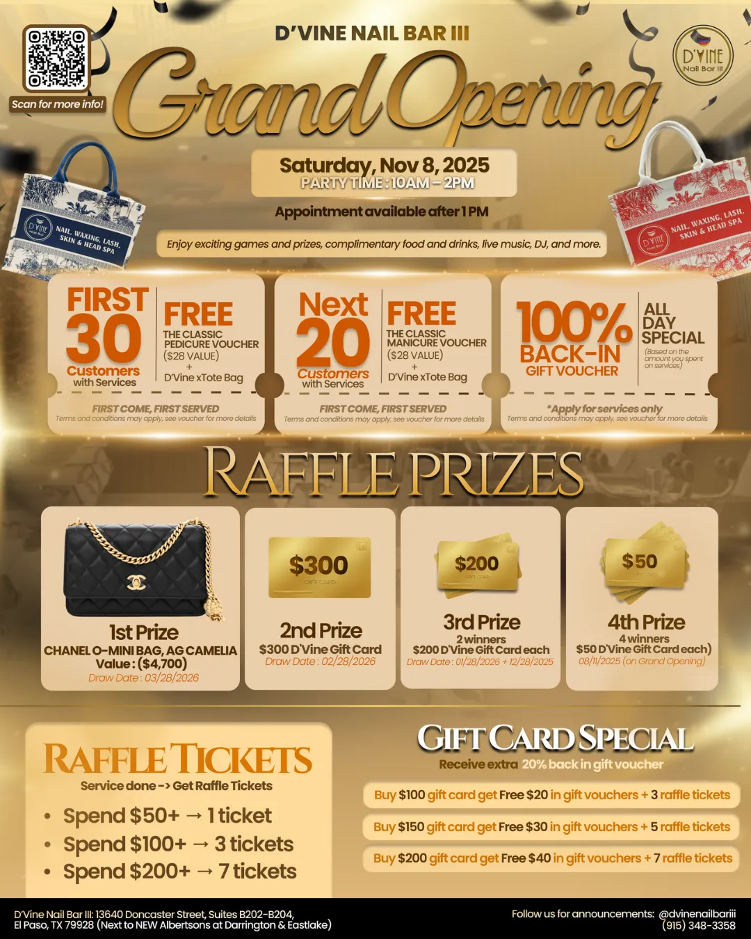 ✨ Next 20 customers (with service) → FREE Classic Manicure Voucher ($28 value) + D’Vine Tote Bag